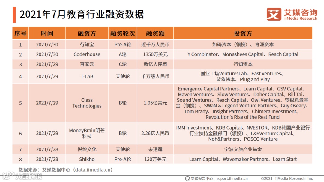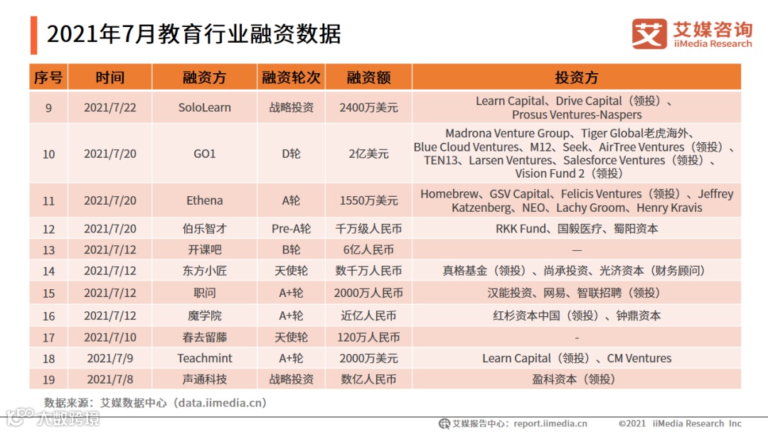 值得一提的是,2020年疫情期间线下教育停课,在线教育一度成为市场的焦点和资本的宠儿,“K12”这个词也穿梭在各类投资融资中,成为教辅机构的“致富经”。然而,今年7月24日,中共中央办公厅、国务院办公厅印发《关于进一步减轻义务教育阶段学生作业负担和校外培训负担的意见》,明确提出全面规范校外培训行为,要求“现有学科类培训机构统一登记为非营利性机构”。随着“双减”落地,K12 阶段融资情况不容乐观。7月K12教育融资事件仅为2起,融资总额为3.08亿元。
