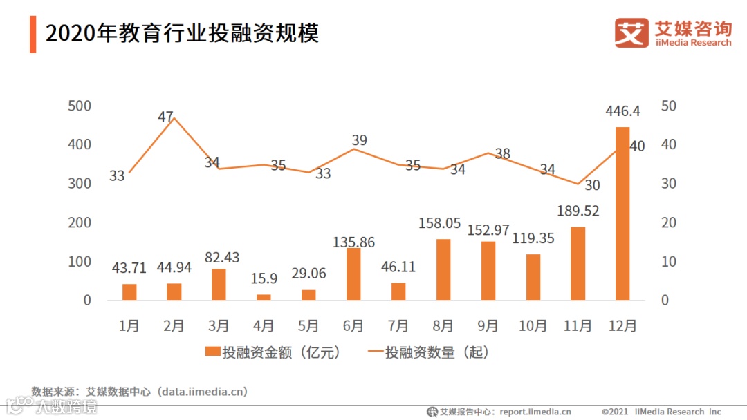 总的来看,今年以来,资本对教育行业的投资热情总体不高,仅有3月和7月融资金额超百亿元。而时间回溯到半年前,教育行业激战正酣,过高的估值,也吸引着投资机构纷纷押注,甚至在IPO前疯狂布局,争抢投资机会。数据显示,2020年教育行业全年融资总额将近1500亿元,仅12月份就拿到446.4亿元融资的好成绩。