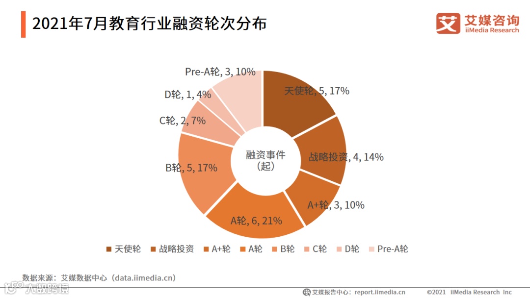 近段时间,艾媒君通过艾媒数据中心(data.iimedia.cn)查询并统计了2021年7月教育行业融资数据。艾媒君发现,在过去的一个月里,教育行业共有29家企业获得融资,融资覆盖轮次从天使轮到D轮,且有4起战略投资。值得一提的是,在 7 月下旬,国家正式颁布落地了传闻许久的“双减”政策,此前星光熠熠的 K12 学科培训赛道趋冷,资本的大船开始驶向职业教育。