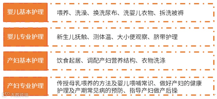 基本的母婴生活护理服务内容有:婴儿基本护理,包括喂养、洗澡、换洗尿布、洗婴儿衣物、拆洗被褥等;婴儿专业护理,包括新生儿抚触、测体温、大小便观察、脐带护理等;产妇基本护理,包括饮食起居、调配产妇营养结构、衣物洗涤等;产妇专业护理,包括传授母乳喂养的方法及婴儿喂哺常识、做好产妇的健康护理及产期常见病的预防、指导产妇做产后操等。此外,涉及到医疗方面的母婴生活护理专业服务,包括如婴儿口腔、皮肤、眼、耳、鼻以及脐带的护理,婴儿意外伤害的紧急处理,产妇的恶露观察处理和哺乳前后乳房的护理等。
