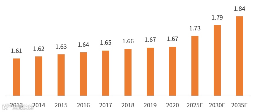 图表19:2013-2035年美国女性人口数量(单位:亿人)