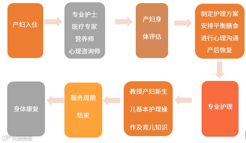 目前,国内月子中心的一般服务流程是产妇在分娩过后与宝宝一起入住月子中心,会所安排专业的医疗团队为产妇及宝宝进行生理、心理评估(但值得注意的是,国内部分月子中心并没有配备专业的医疗团队)并为其制定一系列护理、康复计划,在计划执行过程中为产妇及宝宝提供相应的护理服务,同时对产妇进行产后恢复、新生儿护理、育儿知识等指导意见,另外月子中心还可以根据产妇的个人需求为其提供其它特定的配套服务,直到完成整个服务周期。