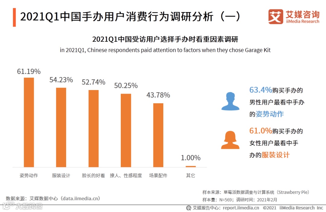 手办方面,艾媒咨询数据显示,2020年中国手办市场规模达28.1亿元,预计到2023年将突破50亿元。在颜值经济推动下,手办颜值成为用户选购的基础。超过6成的受访用户选择合“眼缘”的手办时最看重姿势动作,超过5成的受访用户看重服装设计。此外,脸好看、动作撩人等也是部分受访用户关注手办的重点。