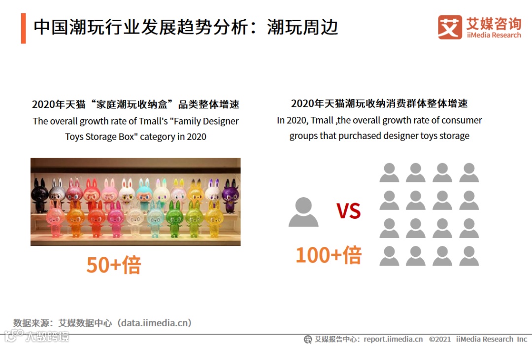 2020年,天猫潮玩收纳消费用户规模同比2019年增长100倍。艾媒咨询分析师认为,随着居民收入增长、消费升级,让人获得满足感的非刚性产品也将走红市场,这就推动潮玩及潮玩周边产品的持续增长。