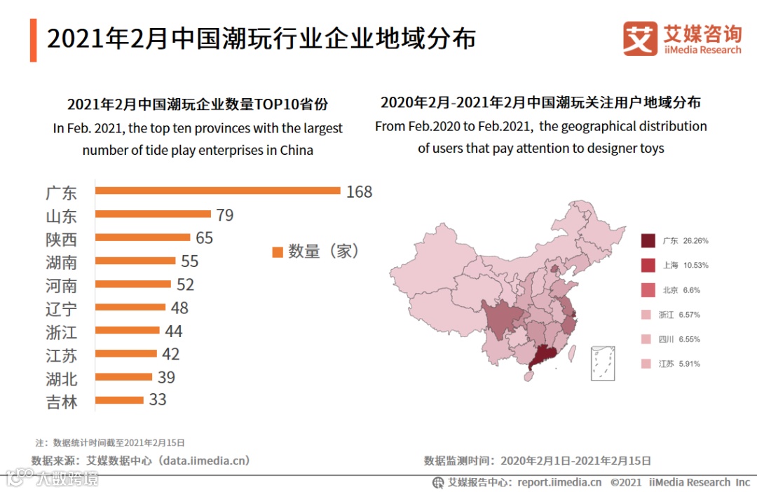 艾媒咨询分析师认为,潮流企业所在地与关注用户的并不完全一致,关注用户多分布在东部沿海及长江中下游地区,随着未来盲盒、手办等实现规模量产,中国中西部及东北地区潮玩关注用户规模将会扩大。
