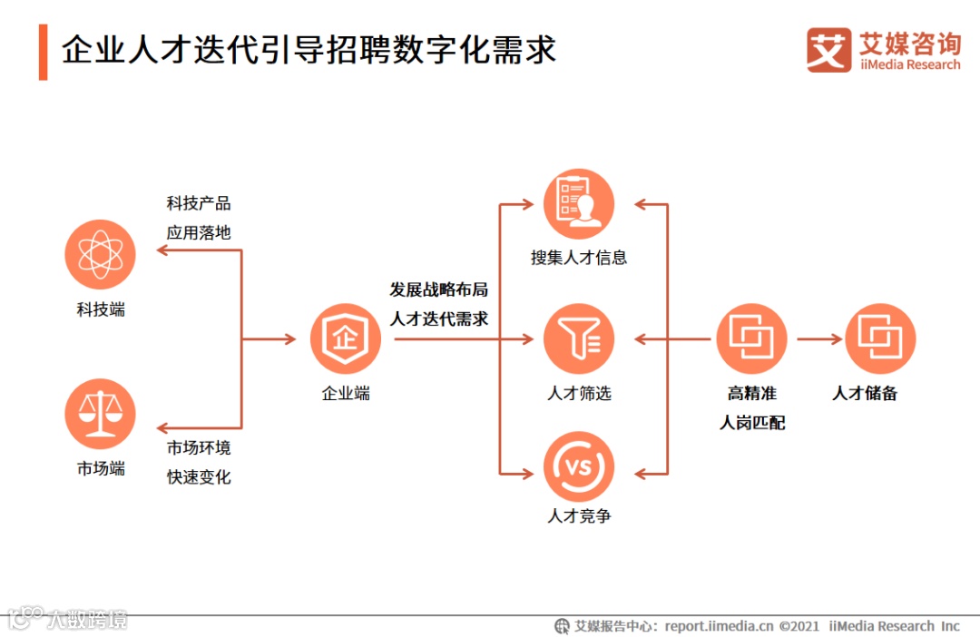 随着科技产品不断应用落地以及市场环境快速变化,为迎合发展需求,企业端不断加快人才迭代进程。企业希望通过科技赋能实现优化招聘工作流程、减轻庞大的招聘工作负担,并满足获取人才信息、人才筛选、人才竞争等招聘需求,通过高精准人岗匹配最终迎合企业发展战略布局实现人才储备。