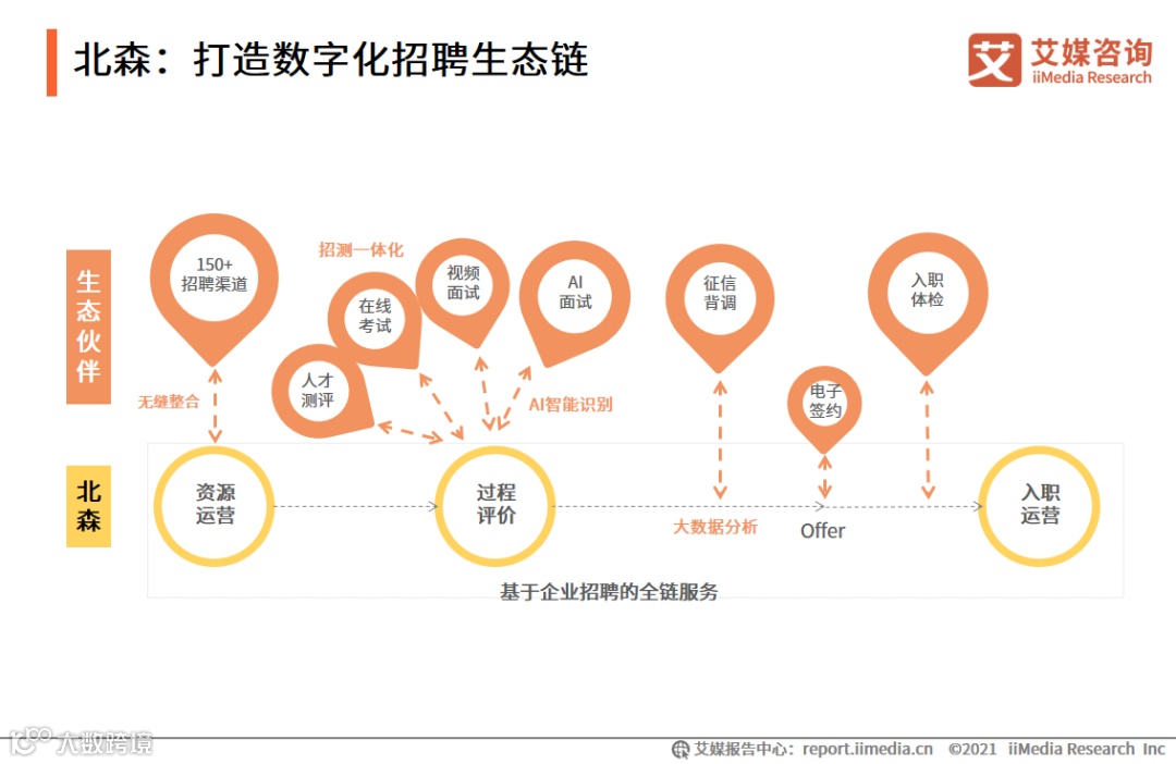 经过多年发展,北森积累了雄厚的专业技术实力,应用场景覆盖招聘及HR管理的全流程。而通过合作、投融资等形式,北森提供基于企业招聘全产业链服务。艾媒咨询分析师认为,北森拥通过聚合产业链力量,联合生态伙伴布局并完善产品布局,在服务全面性上占有优势。但北森覆盖HR业务全流程,因此在AI前沿技术应用方面通用性特点更突出,与垂直招聘数字化企业相比,其技术应用与招聘流程特点的契合度较低。