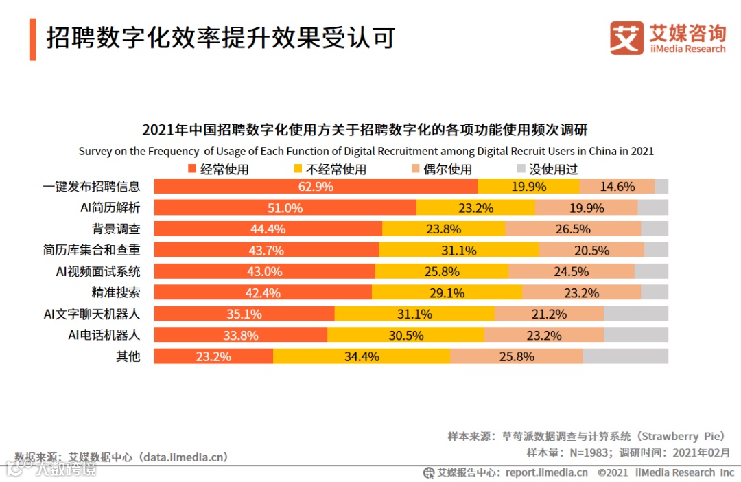 图表13. 2021年中国招聘数字化使用方关于招聘数字化的各项功能使用频次调研