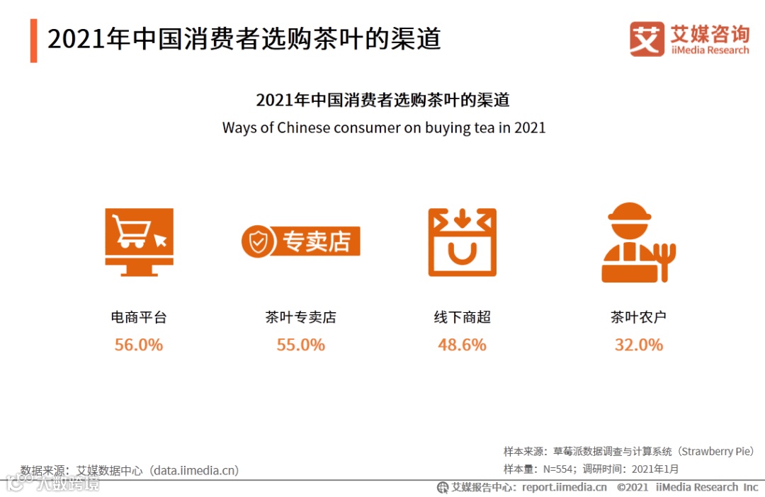 数据显示,2021年中国消费者选购茶叶的三大渠道分别是电商平台(56.0%)、茶叶专卖店(55.0%)和线下商超(48.6%)。