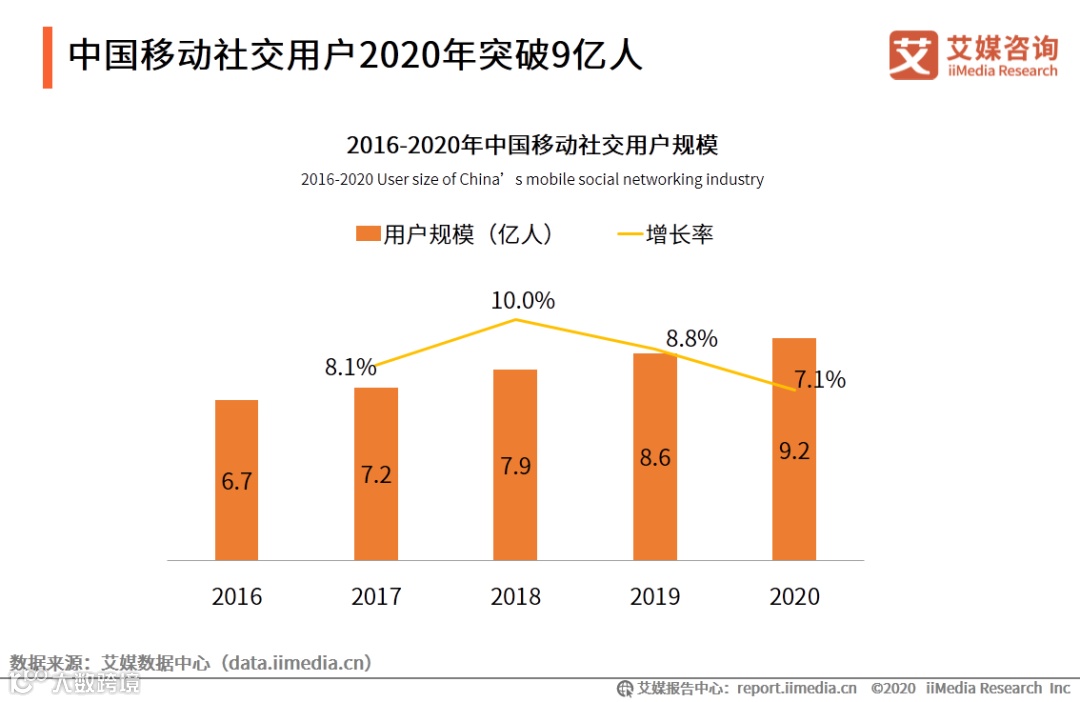 iiMedia Research(艾媒咨询)数据显示,2020年中国移动社交用户规模突破9亿人,较2019年增长7.1%。艾媒咨询分析师认为,随着图片社交、声音社交、视频社交等产品形态的创新以及革新,移动社交市场将保持稳健发展态势,用户渗透率稳步增长。