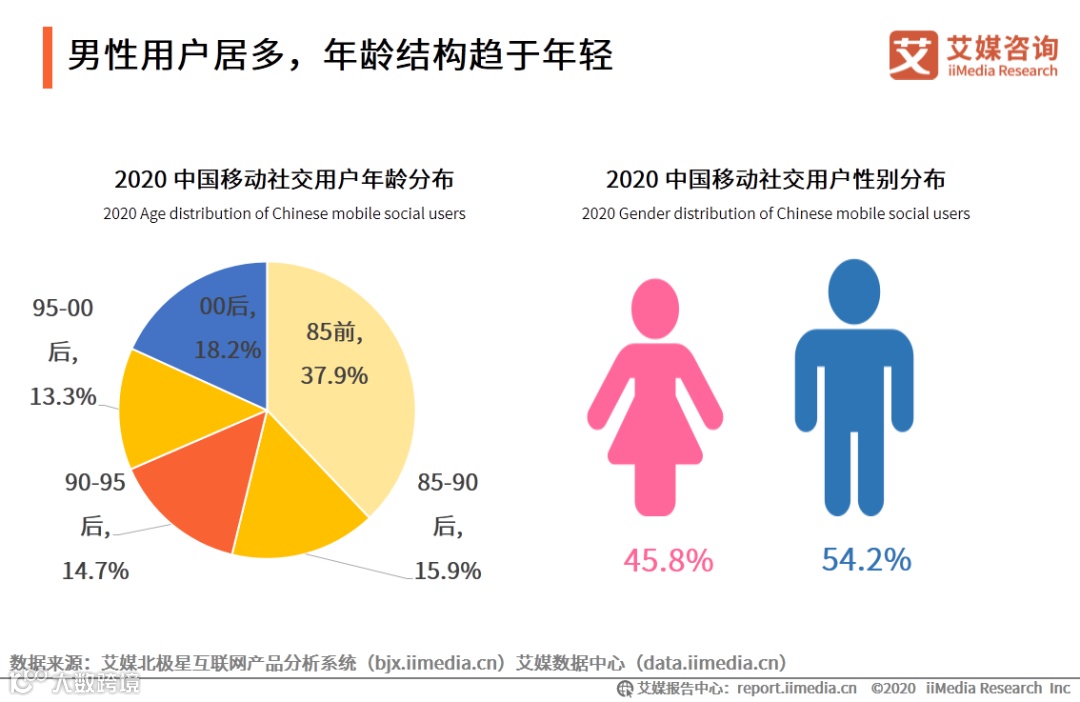 iiMedia Research (艾媒咨询)数据显示,移动社交用户男性占比达54.2%。在年龄分布上,95后、00后占比持续提升,移动社交用户年龄结构趋于年轻。艾媒咨询分析师认为,95后、00后实力崛起,用户群体年轻化趋势明显。同时,随着大众移动社交意识进一步提升,女性用户占比以及活跃度逐渐提升,在移动社交生活中的主动性也渐趋提升。