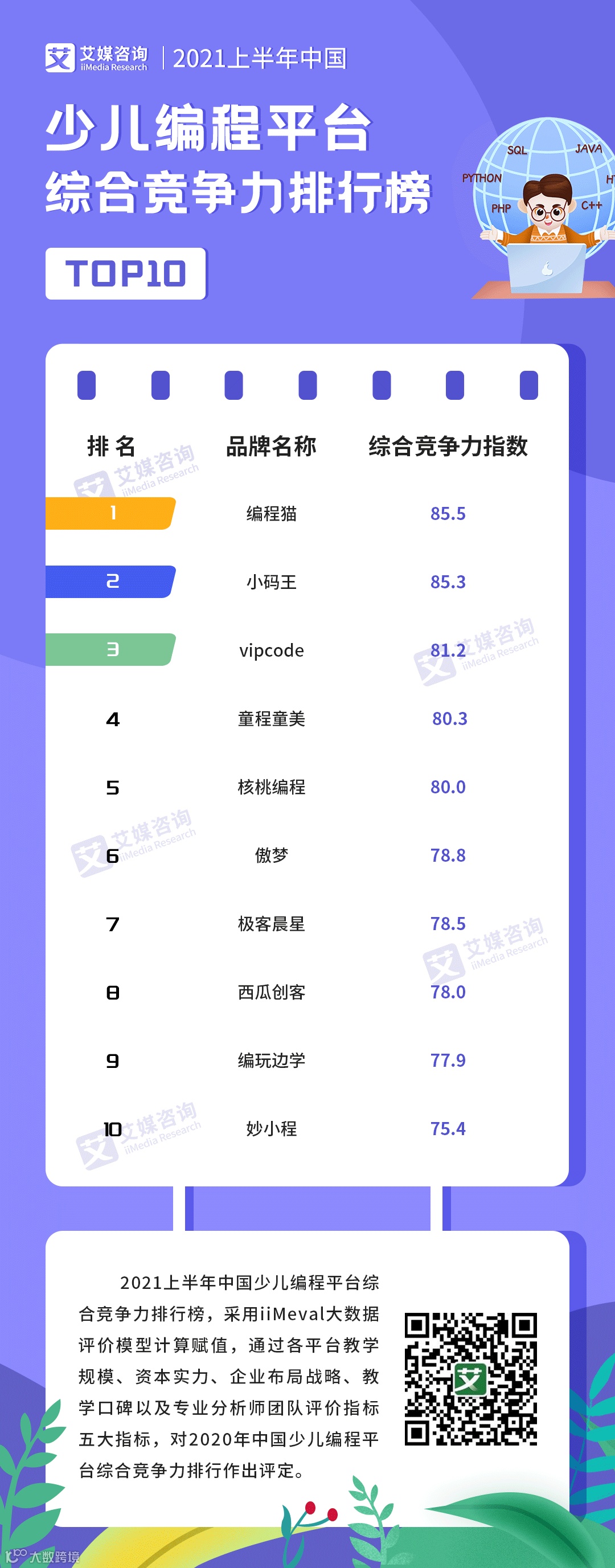 艾媒金榜最新发布《2021年中国少儿编程平台综合竞争力排行榜》,此榜单采用iiMeval大数据评价模型计算赋值,通过各平台教学规模、资本实力、企业布局战略、教学口碑以及专业分析师团队评价指标五大指标,对2021年中国少儿编程平台综合竞争力排行作出评定。