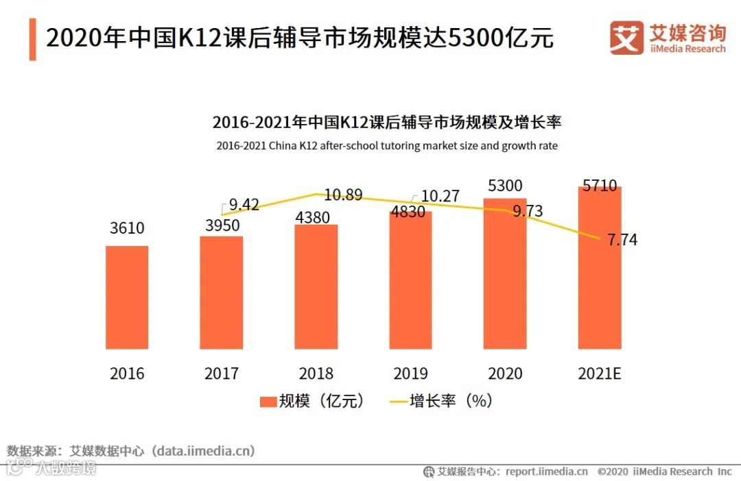 iiMedia Research(艾媒咨询)数据显示,2019年中国K12课后辅导市场规模达4830亿元,预计2021年将达到5710亿元。艾媒咨询分析师认为,随着给学生减负的政策落实和素质教育的深入,中小学教育市场的课外培训辅导需求扩大,K12校外培训以及素质教育培训市场一直保持较高的热度。