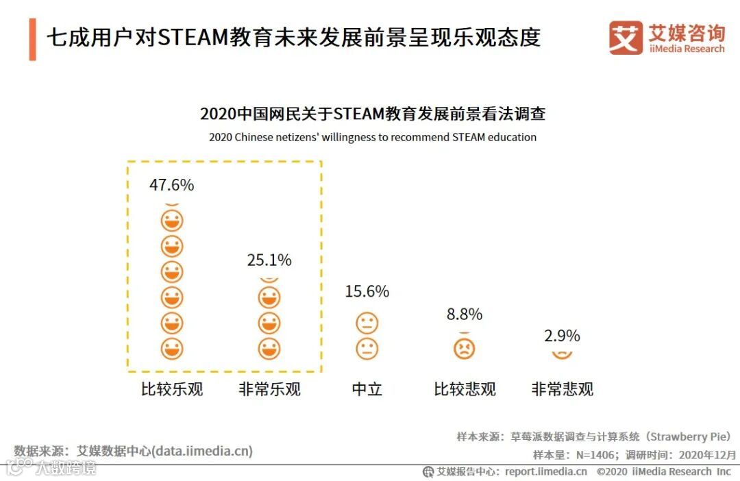 此外,iiMedia Research(艾媒咨询)数据显示,超过七成的受访网民对STEAM教育未来发展前景表示乐观。在经济、政策及科技的加持下,STEAM教育将进入高速发展阶段。在市场需求旺盛的背景下,未来趋势朝向系统化、专业化、服务化方向发展。