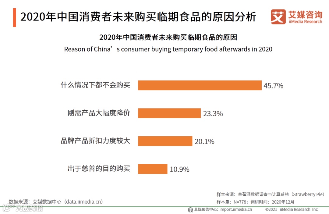 艾媒咨询数据显示,2020年有超过60%的消费者对临期食品带有一定的负面印象,超过50%的消费者购买频率少于每月一次。并且,依然有超过45%的中国消费者表示在未来依然不会购买临期食品。
