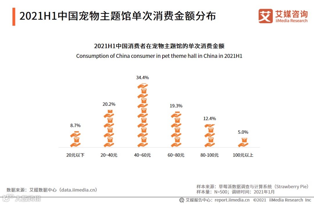 消费数据方面,2021H1中国消费者在宠物主题馆中单次的消费金额在20-60元的占比为54.6%,消费超过100元的消费者仅占5.0%。目前,宠物主题馆的盈利模式以入场费为主,单次价格在50元左右。
