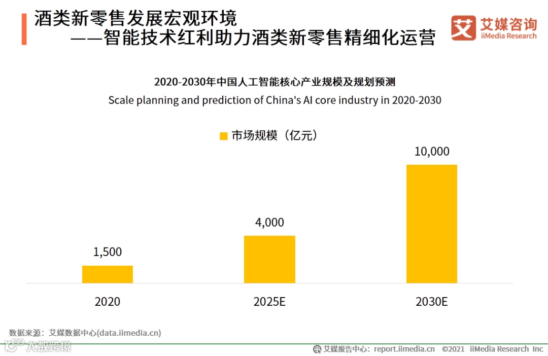 iiMedia Research(艾媒咨询)数据显示,未来十年中国人工智能核心产业规模将达到10000亿元。艾媒咨询分析师认为,人工智能技术不断进步及创新,酒类新零售行业获得技术红利,技术的融合及落地应用将有利于酒类新零售行业精细化运营,有效提高仓储物流、支付、售后服务等环节的服务质量。