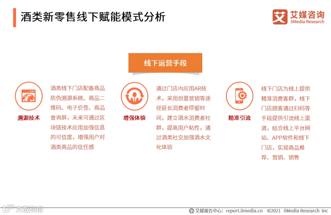 艾媒咨询分析师认为,酒水新零售线下运营核心价值在于体验增强和流量引导。由于线下门店具有线上运营所不具备的“实物”特征,故能克服酒水线上运营时用户信任低等痛点。伴随商品溯源技术发展,门店酒类商品可以配备商品防伪溯源系统、商品二维码、电子价签等,发挥线下酒类门店的社交属性,推动酒水新零售线下运营更加高效地提高消费者购物体验,并将酒水消费者引流线上,推动线上线下渠道协同发展。