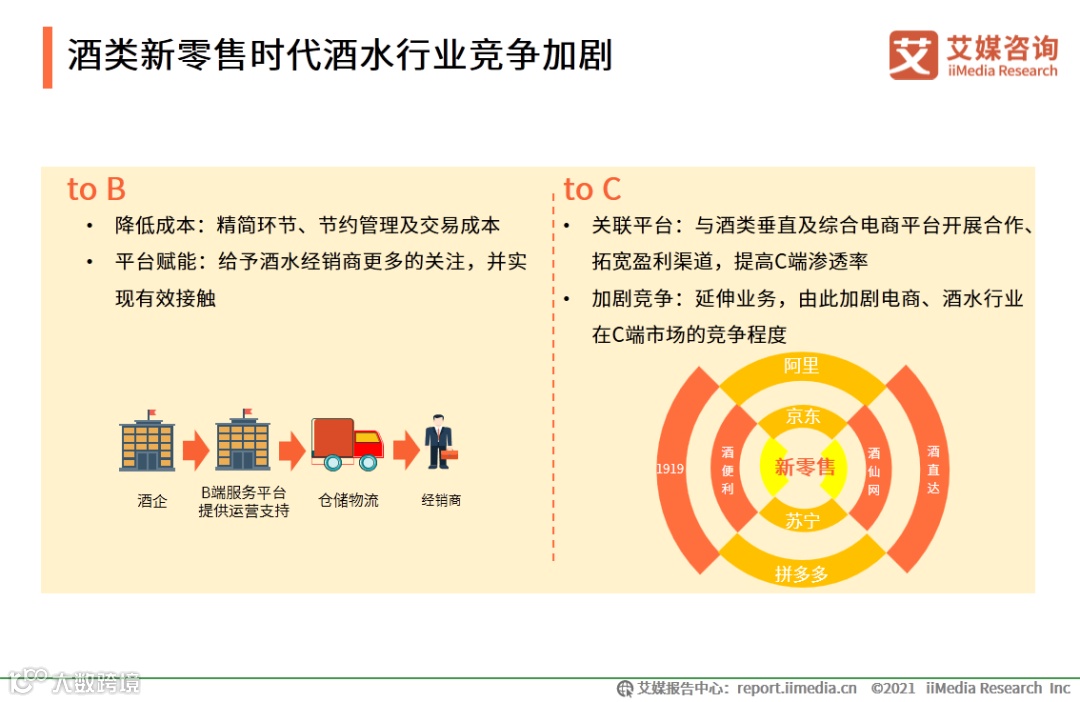 艾媒咨询分析师认为,在B端环节,酒类新零售平台有效帮助酒企精简交易流程,通过平台赋能,促进酒企更有效地接触经销商;对于C端,酒类垂直电商和综合电商平台成为酒企的另一重要合作渠道,与传统渠道相比,电商渠道更能有效提高酒企的C端渗透率,并进一步加剧电商、酒水等行业竞争。