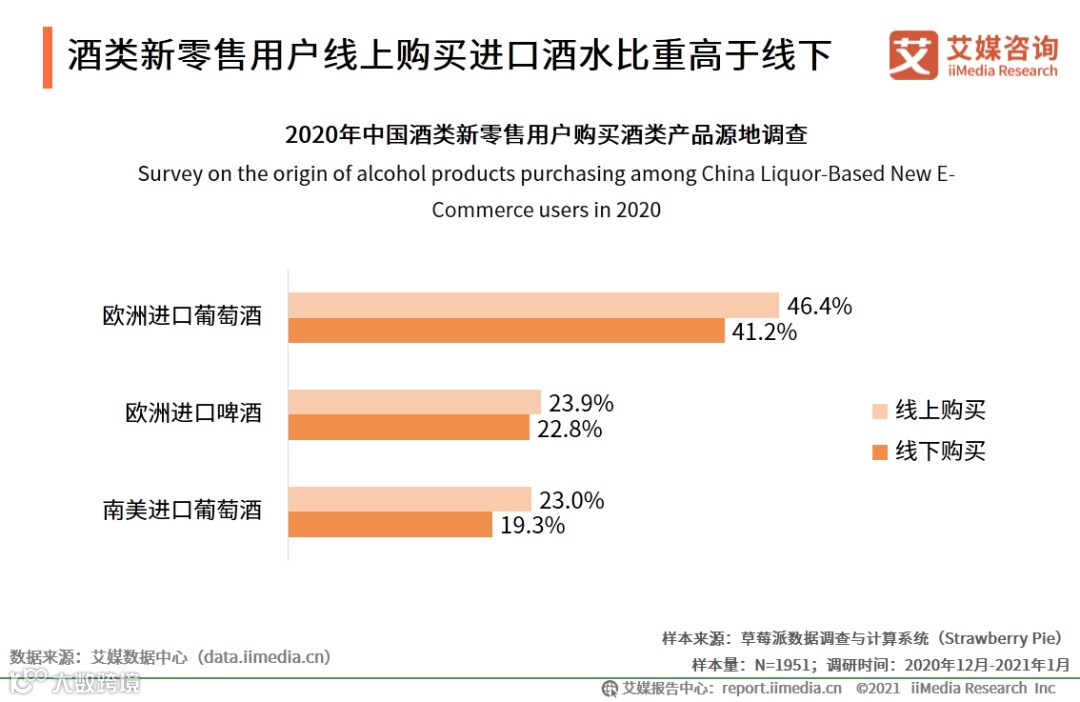 酒类新零售用户线上购买进口酒水比重高于线下