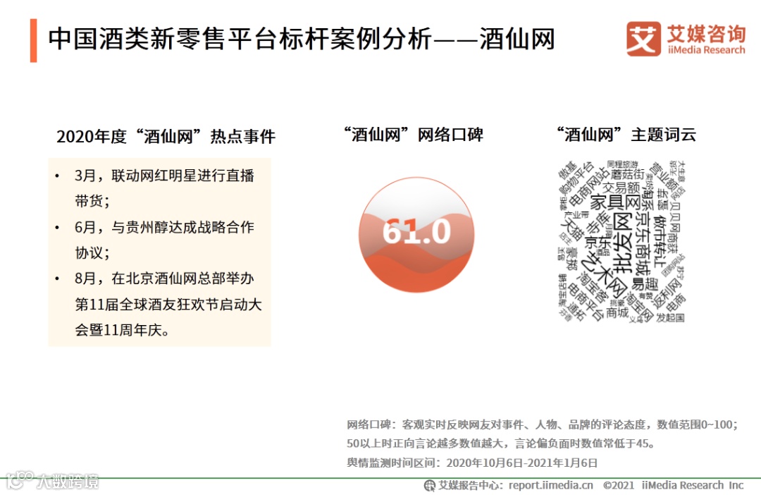 艾媒商舆情数据监测系统显示,系统监测期间 ,“酒仙网”的网络评价良好,网络口碑指数为61.0。2020年3月起,酒仙网开始抓住直播带货风口,布局“新零售+直播”模式,结合多渠道为线上引流。2020年6月,平台与酒企达成战略合作,由此逐步完善供应链上游,赋能酒企商家。在疫情冲击下,酒仙网2020年仍有不少亮眼表现。