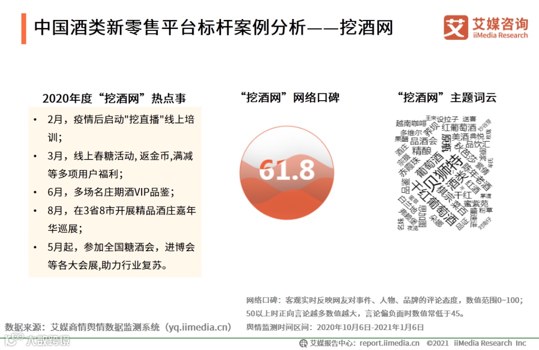 艾媒商舆情数据监测系统显示,系统监测期间 ,“挖酒网”的网络评价较高,网络口碑指数为61.8。疫情期间,“挖酒网”在维持精细化管理和为用户提供定制化服务外,积极开展专业培训。2020年8月“挖酒网”在8个城市开展 “精品酒庄嘉年华巡展”活动,对市场趋势和销售策略进行深入探讨,为品牌赢得较好口碑。