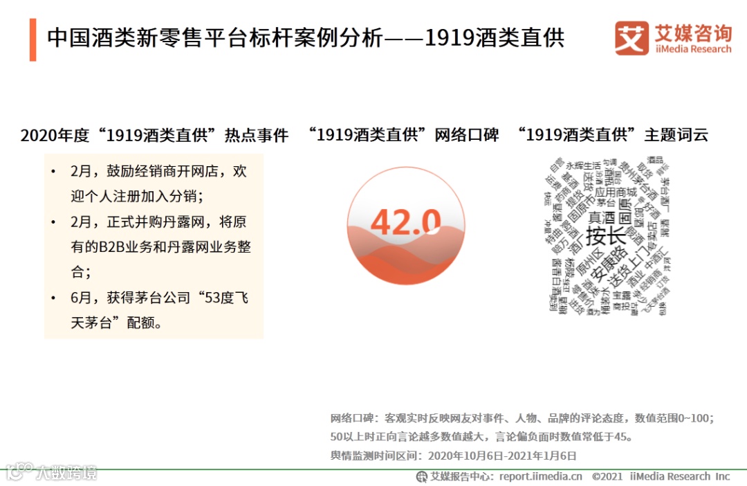 艾媒商舆情数据监测系统显示,系统监测期间 ,“1919酒类直供”的网络评价良好,网络口碑指数为42.0。2020年2月,1919酒类直供逐渐布局社交渠道,增加私域流量,同时收购国内大型B端供应链平台——丹露网,整合丹露网B端资源后,1919酒类直供正加速B2B业务的布局,目前1919酒类直供从B端和C端两端发力 ,逐渐在消费者中得到更多的曝光。