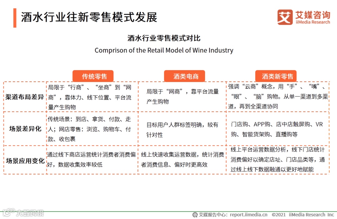 艾媒咨询分析师认为,酒类商品具有不易运输的特点,而传统酒类经销体系以先付款后发货模式为主,行业话语权掌握在供应商手上,行业“二八原则”现象严重,巨头占据主要利润,不利于酒水业多元化发展。而酒类新零售发展在渠道和经营体系上为酒水行业带来革新,线上线下融合减少中间商环节,且利用大数据赋能为商家提供精细化运营支撑,能有效突破传统经销体系局限,发展前景看好。