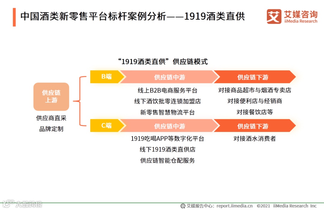 “1919酒类直供” 成立于2006年,1919酒类直供平台已形成C端业务、B端业务、衍生业务三大板块,采用“厂商直采+全面供应链+专业仓储物流”模式,通过整合供应商资源、线上平台服务、线下批发零售门店服务、智能仓储物流、提供综合运营解决方案等业务板块,构建了国内酒类新零售综合服务和数字化垂直电商平台。