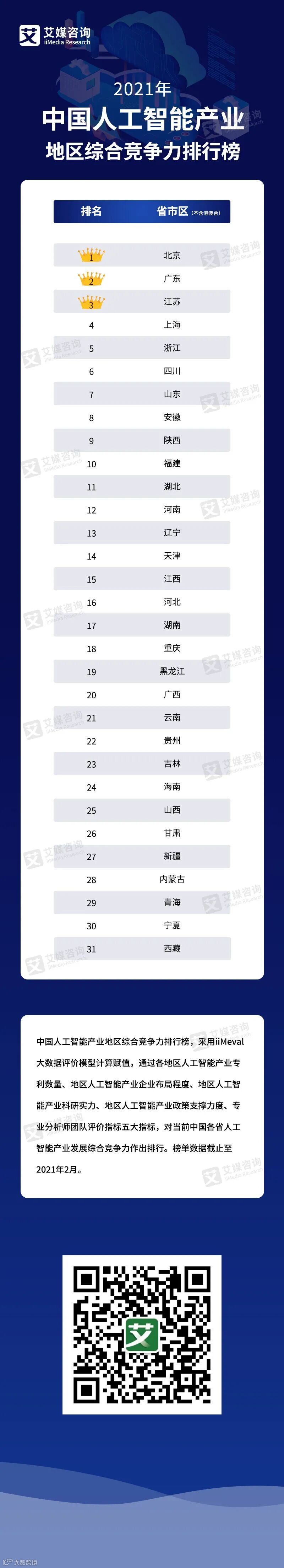 艾媒金榜最新发布《2021年中国人工智能产业地区综合竞争力排行榜》,此榜单采用iiMeval大数据评价模型计算赋值,通过各地区人工智能产业专利数量、地区人工智能产业企业布局程度、地区人工智能产业科研实力、地区人工智能产业政策支撑力度、专业分析师团队评价指标五大指标,对当前中国各省人工智能产业发展综合竞争力作出排行。