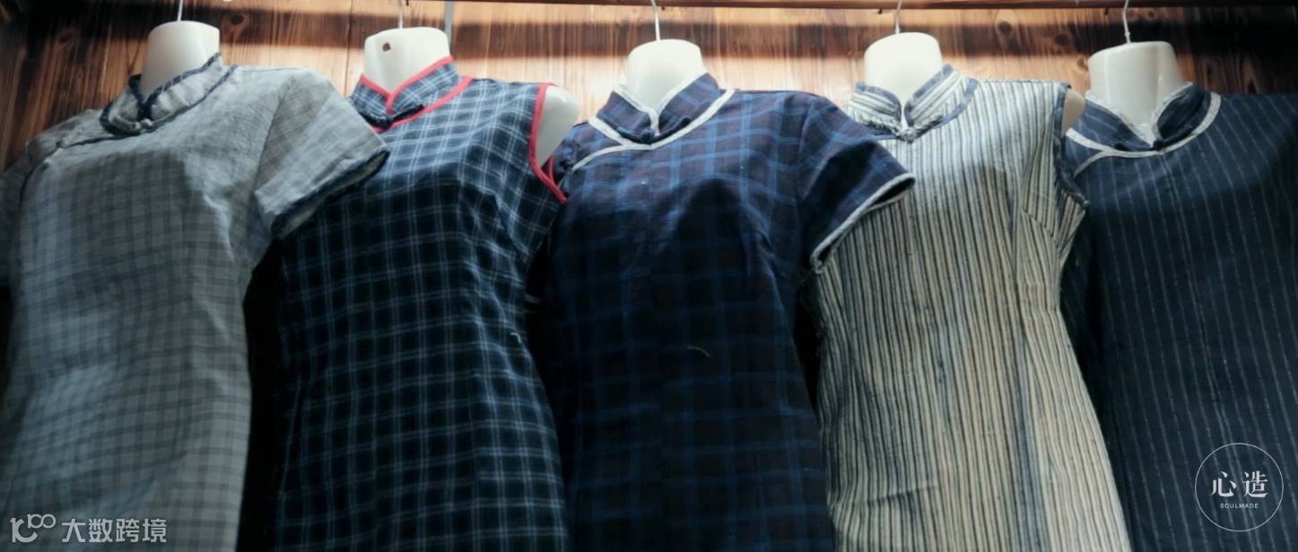土布坊的墙壁一侧挂满了阿婆们做好的土布衣裳,色调古朴雅致,款式经典耐看。这种古典江南韵味服饰让人想停驻,想拥有。想象一个女子,穿着这件素雅的旗袍,恰到好处的长度显得身材更加婀娜多姿,古朴的色彩把她衬托得更加白净精巧,土布做成的旗袍散发着棉花的清香,这一切,都让人沉醉其中……