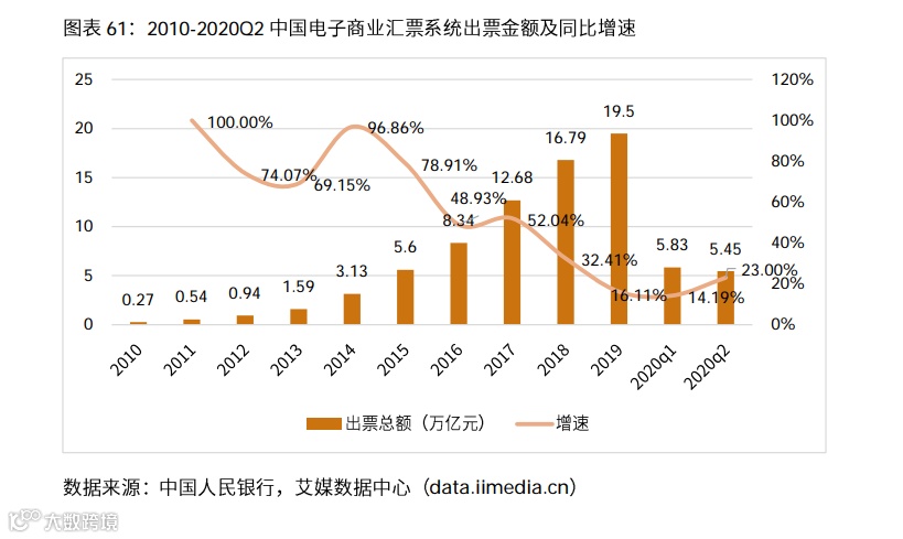 图表62:2010-2020Q2中国电子商业汇票系统出票金额及同比增速