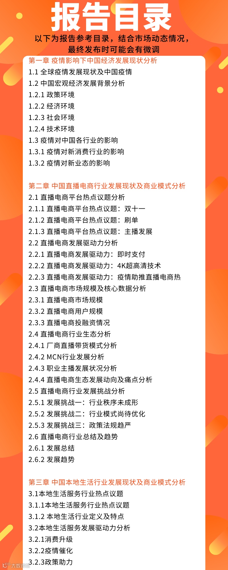 《2021中国新业态商业发展趋势分析报告》根据艾媒数据中心、艾媒咨询商业情报数据库、艾媒商情舆情数据监测系统基础数据,对全球及中国疫情发展现状、疫情影响下各行业发展现状等进行了全面分析,具体针对直播电商、本地生活、文娱消费等新业态,以及医美/轻医美、母婴、养老等消费行业进行了深度解读,并结合12个以上典型企业进行案例分析,对行业经济发展新趋势进行预判。