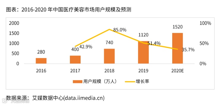 数据显示,2018年中国医美市场用户规模达到740万人,预计2020年将达到1520万人。艾媒咨询分析师认为,2020上半年,受新冠疫情影响,行业到店服务客户明显减少。但随着疫情逐步好转恢复,2020年第二季度中国医美行业的线上交易总额同比增长112%,平台医美相关搜索热度4月份已经赶超1月的数据,行业有望在2020下半年迎来报复性反弹,医美行业将持续保持稳步发展态势。