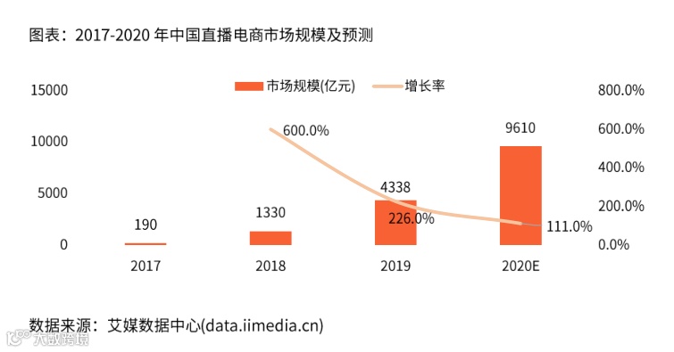 数据显示,2019年中国直播电商市场规模为4338亿元,预计2020年将达到9610亿元。疫情期间,“宅经济”的兴起,刺激了直播行业高速发展、固化用户习惯;同时,“直播+”模式赋能行业转型,重构运营场景、助推传统行业,在线直播行业旨在持续发展中拓宽商业潜力与社会价值。目前,中国的直播电商行业已经不止是单纯的商品“带货”,由于疫情而催生出的诸如云旅游、直播卖房等新模式,使得在线直播真正渗透到了各行各业中,成为一个基于数字化建设的销售工具。