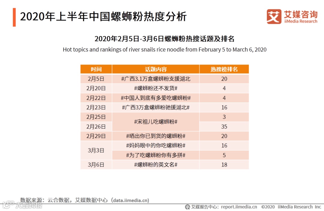 疫情期间,“宅经济”形势下,柳州螺蛳粉强势崛起。2020年上半年,关于螺蛳粉的话题频频空降微博热搜榜。2020年2月5日至3月6日,螺蛳粉在1个月内空降微博热搜榜高达10次。而相关话题也累计达到了二十几亿阅读量,几百万的讨论。其中#螺蛳粉还不发货#、#螺蛳粉自由#两个话题,仅讨论就有75万,而阅读量更是高达5亿。