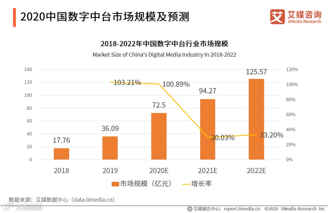 近年来,中国数字中台市场规模一直保持稳步增长。iiMedia Research(艾媒咨询)数据显示,2019年中国数字中台规模为36.09亿元,同比增长103.21%。预计2022年有望达到125.57亿元。