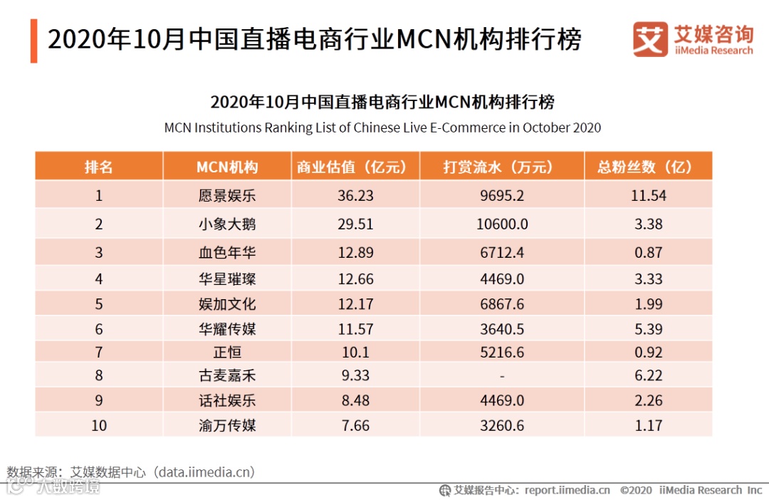 4. 2020年9-10月中国直播电商行业数据榜单分析:MCN机构榜