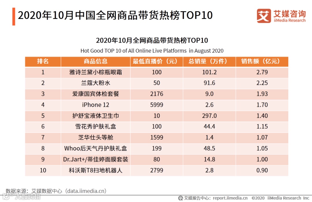 3.1 2020年10月中国全网商品带货热榜TOP10