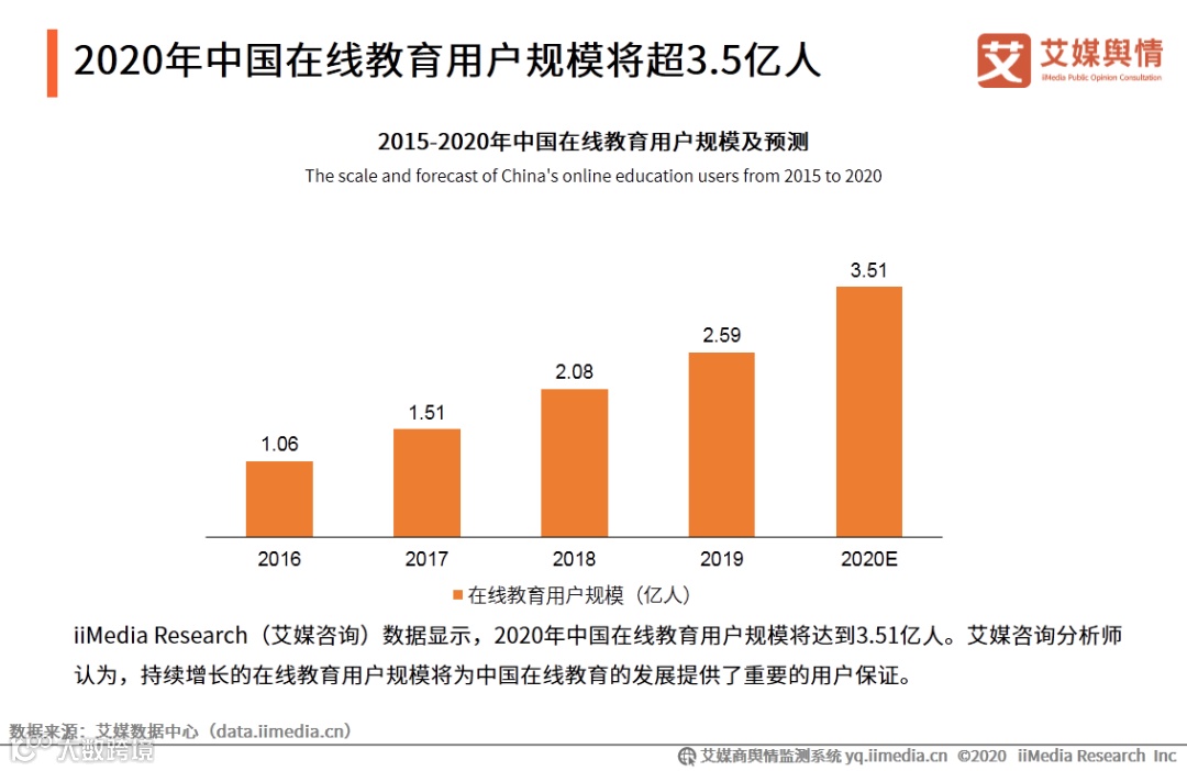 iiMedia Research(艾媒咨询)数据显示,2020年中国在线教育用户规模将达到3.51亿人。艾媒咨询分析师认为,持续增长的在线教育用户规模将为中国在线教育的发展提供了重要的用户保证。