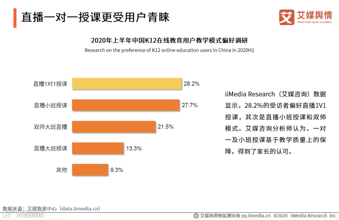iiMedia Research(艾媒咨询)数据显示,28.2%的受访者偏好直播1V1授课,其次是直播小班授课和双师模式。艾媒咨询分析师认为,一对一及小班授课基于教学质量上的保障,得到了家长的认可。