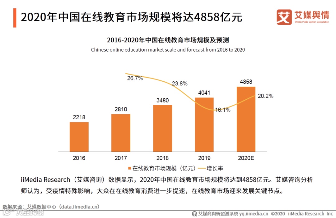 iiMedia Research(艾媒咨询)数据显示,2020年中国在线教育市场规模将达到4858亿元。艾媒咨询分析师认为,受疫情特殊影响,大众在在线教育消费进一步提速,在线教育市场迎来发展关键节点。