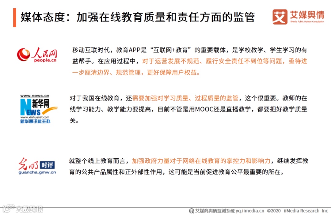 1. 媒体态度:加强在线教育质量和责任方面的监管