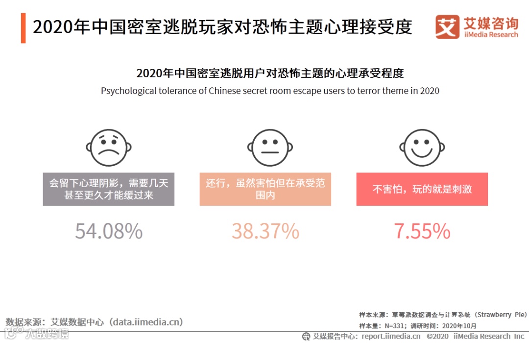 多数密室逃脱商家打出“鬼”“死亡”“丧尸”等恐怖元素来吸引玩家,但不同玩家对恐怖主题的接受度不同。数据显示,超过5成的受访用户认为玩恐怖主题密室逃脱游戏会留下阴影,如2020年8月7日,北京日报曾爆出“恐怖密室主题逃脱吓坏小学生”的新闻。因而密室逃脱商家在密室逃脱主题设计上不能单纯为了恐怖而设计恐怖环节,还应合理根据人群细分情况合理设计恐怖主题,或者选取更广泛的其他感官刺激要素。