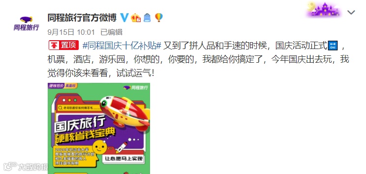 据携程旅游大数据实验室发布的“2020十一长假旅游性价比报告”统计显示,从国内旅游市场恢复情况看,预测今年国庆中秋8天长假旅游人次可能达到6亿。