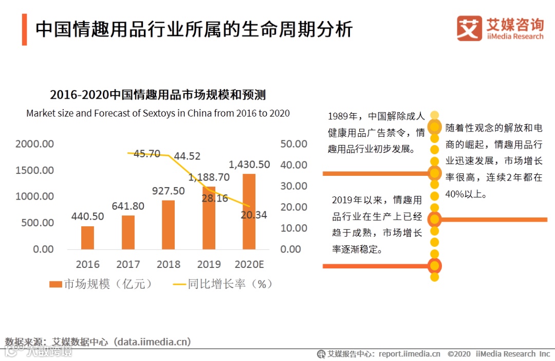 艾媒咨询分析师认为,情趣用品行业在生产上已经趋于成熟,市场增长率逐渐稳定。随着性观念的解放和电子商务的迅速发展,情趣用品行业在成熟期后也不会迅速衰退。