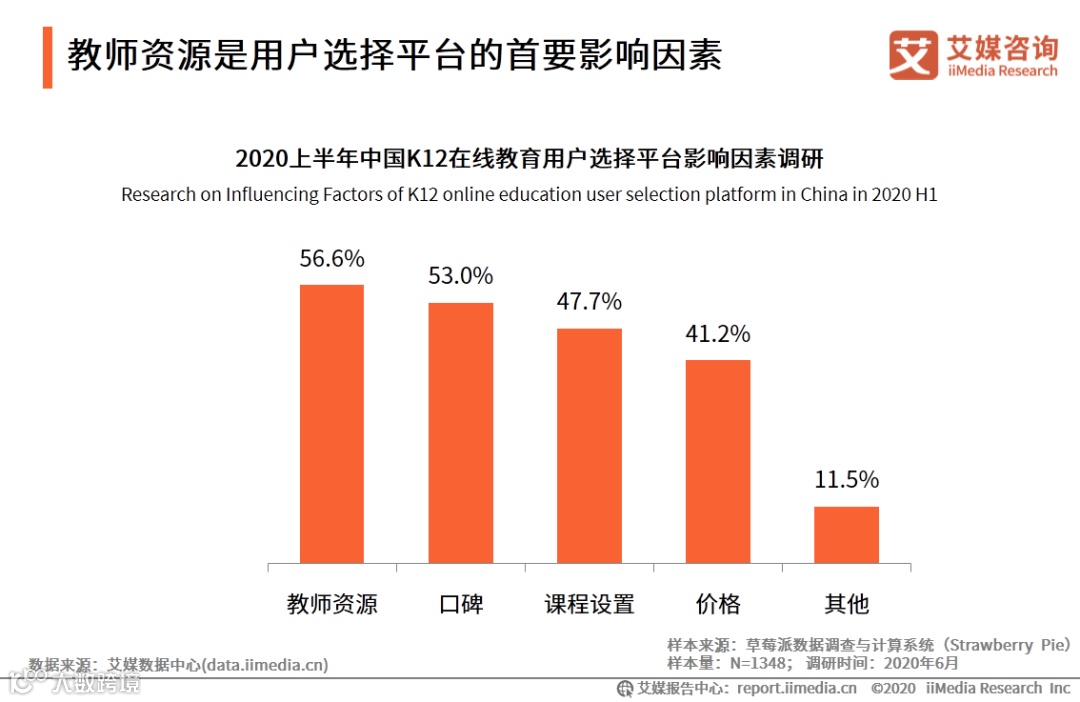iiMedia Research(艾媒咨询)数据显示,56.6%的受访者在选择K12教育平台时会考虑教师资源,其次是口碑、课程设置和价格。艾媒咨询分析师认为,K12在线教育平台突出平台师资优势可吸引用户试听课程进而转化购买。