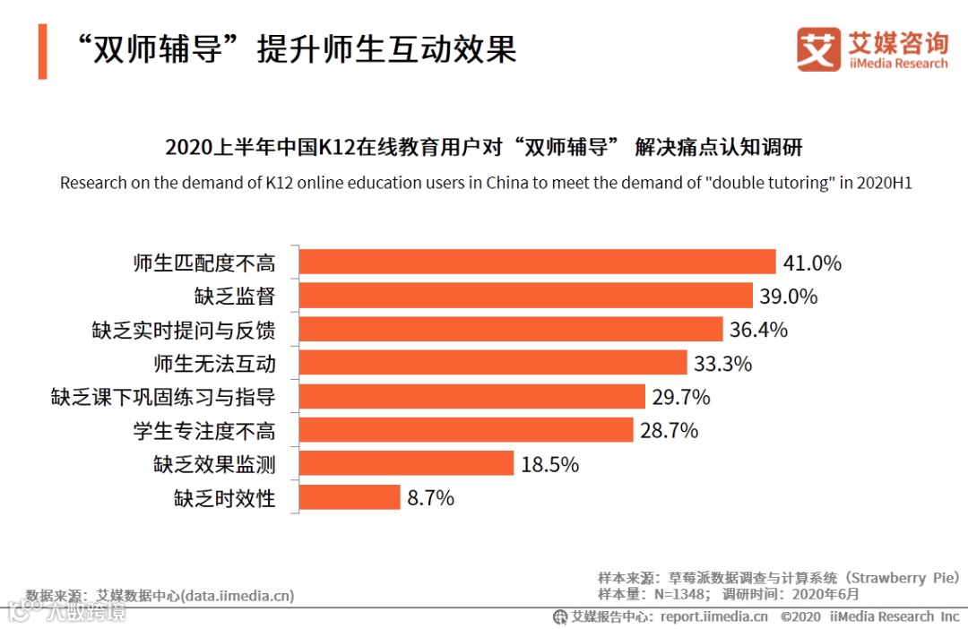 iiMedia Research(艾媒咨询)数据显示,41.0%的受访者认为“双师辅导”可以解决师生匹配度不高的问题, 超过30.0%的受访者认为“双师辅导”可以解决缺乏监督、缺乏实时提问与反馈以及师生无法互动问题。艾媒咨询分析师认为,“双师辅导”能有效跟踪学生学习效果,从而解决师生在匹配度还有课后监督问题,打造更高效的效果反馈机制。