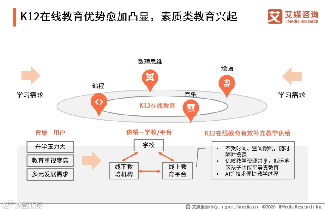 随着升学压力增大、社会对教育的重视程度逐渐增强,覆盖幼儿园到高中人群且满足用户碎片化、远程学习需求的K12在线教育市场将持续发展。80后、90后父母对素质教育需求的扩大,也进一步带动了在线素质教育的兴起。其中,少儿编程类、数理思维类和绘画类在线素质教育受到资本市场及学生家长的青睐。