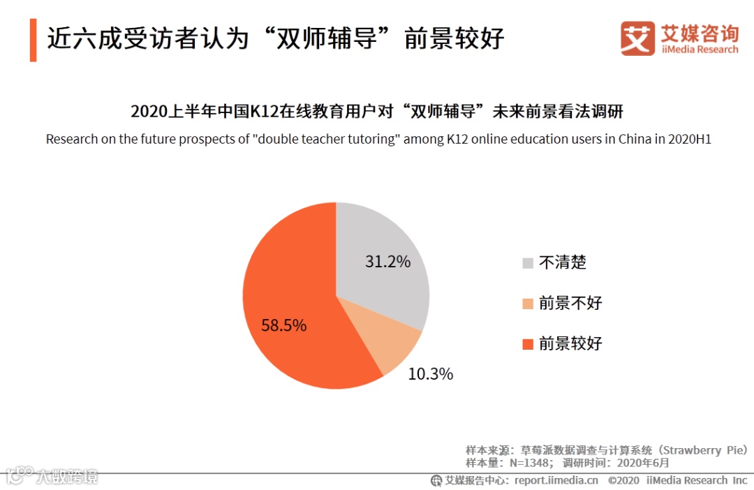 iiMedia Research(艾媒咨询)数据显示,58.5%的受访者认为“双师辅导”前景较好,仅有10.3%的受访者认为“双师辅导”前景不好。艾媒咨询分析师认为,“双师辅导”有效赋能线下教育机构,促进教育资源的进一步均衡。